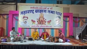 धार/नानेवाडी स्थित महाराष्ट्र ब्राम्हण समाज में दस दिवसीय गणेश उत्सव के दौरान चल रहे सांस्कृतिक और धार्मिक कार्यक्रम के अंतर्गत भोपाल के आकाशवाणी व दूरदर्शन के कलाकार मुकेश बनसोडे एवं उस्ताद अलाउद्दीन खा संगीत कला अकादमी के उप निदेशक तथा स्वर गंधार संगीत कला अकादमी के निदेशक शेखर करहाड़कर ने गणेश वंदना, ओंकार स्वरूपा तुझ नमो, माझे माहेर पंडरी सहित अनेक मराठी भजनों की प्रस्तुती दी उनके साथ तबले पर आशीष पुराणिक तथा हारमोनियम पर संगीत महाविद्यालय की जनभागीदारी समिती के अध्यक्ष दीपक खलतकर ने संगत की ,कार्यक्रम के आरम्भ में समाज अध्यक्ष अरुण उज्जैनकर वरिष्ठ कार्यकारिणी सदस्य उदय वडनेरकर ,अजय उज्जैनकर,प्रकाश फाटक, संजीव पुराणिक उत्सव समिति के अध्यक्ष पुष्पेश वेद्य,सचिव हर्षद वडनेरकर ने पुष्प माला और श्रीफल देकर स्वागत किया कार्यक्रम का संचालन प्रवीण उज्जैनकर ने किया तथा आभार मिलिंद नाईक ने माना।