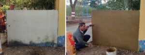 चित्र में कार्यशाला में निर्मित पेंट से पूती दीवार