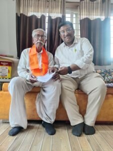 धार।माँ सरस्वती मंदिर भोजशाला की मुक्ति और उसके गौरव की पुनर्स्थापना के आंदोलन और अभियान के पुरोधा, वरिष्ठ हिंदू नेता श्रद्धेय विमल जी गोधा (95 वर्ष )से आशीर्वाद लेकर उन्हें ASI रिपोर्ट की कॉपी भेंट करी।
